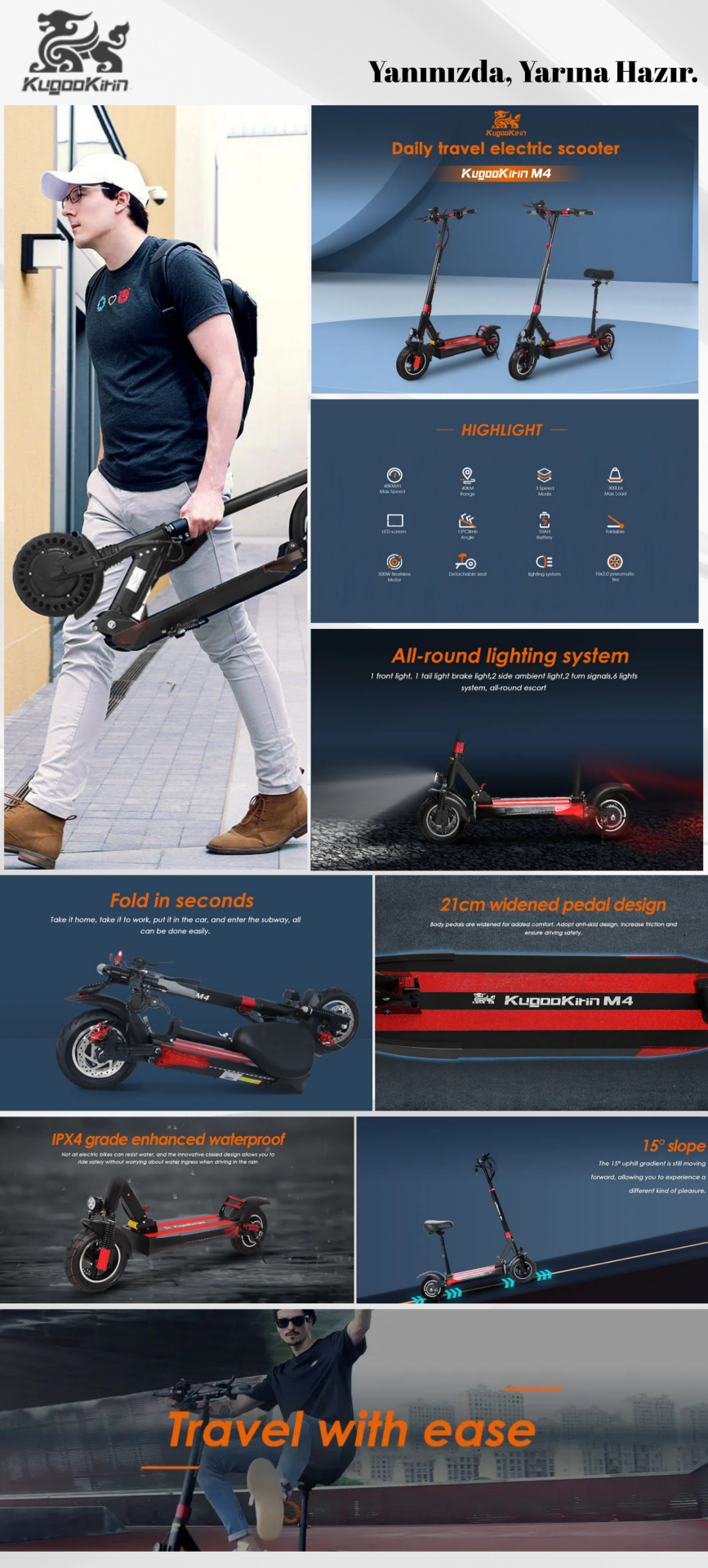 Lüks 500 W motor ve güçlü 48 V/528 WH lityum pil ile tasarlanan en uygun fiyatlı elektrikli scooter Kugoo Kirin M4, 35 km'ye kadar sürüş mesafesi ve %15 tırmanma kapasitesiyle sürüşe devam etmenizi sağlar. Elektrikli scooter, taşınabilir olacak şekilde tasarlanmıştır; saniyeler içinde katlanabilir, bu da onu işe gidip gelmeniz için mükemmel bir çözüm haline getirir.